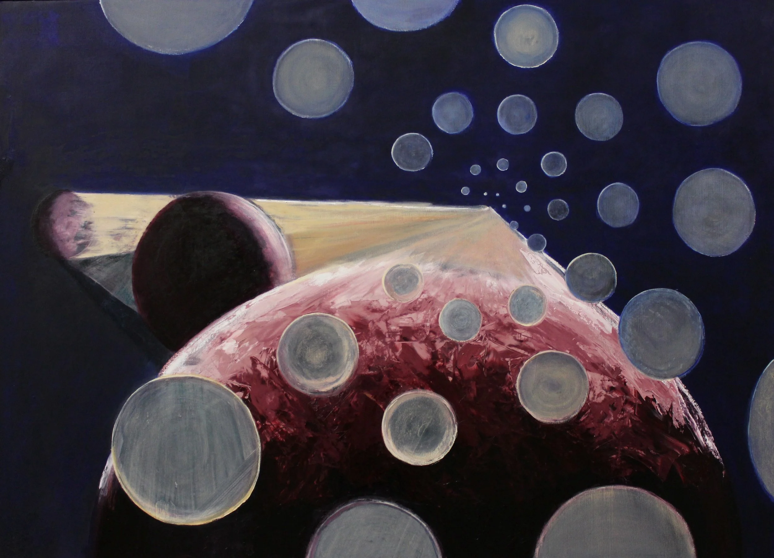 This physical reality and how we represent it visually was partly what inspired this painting. The other part was sort of a human equivalent, or our emotional reality. Our actions have a profound effect on the people we know and beyond, to the world around us. And conversely, we are reacting to the actions of others all the time. On both ends, we can’t seem to escape the emotional toll it takes.